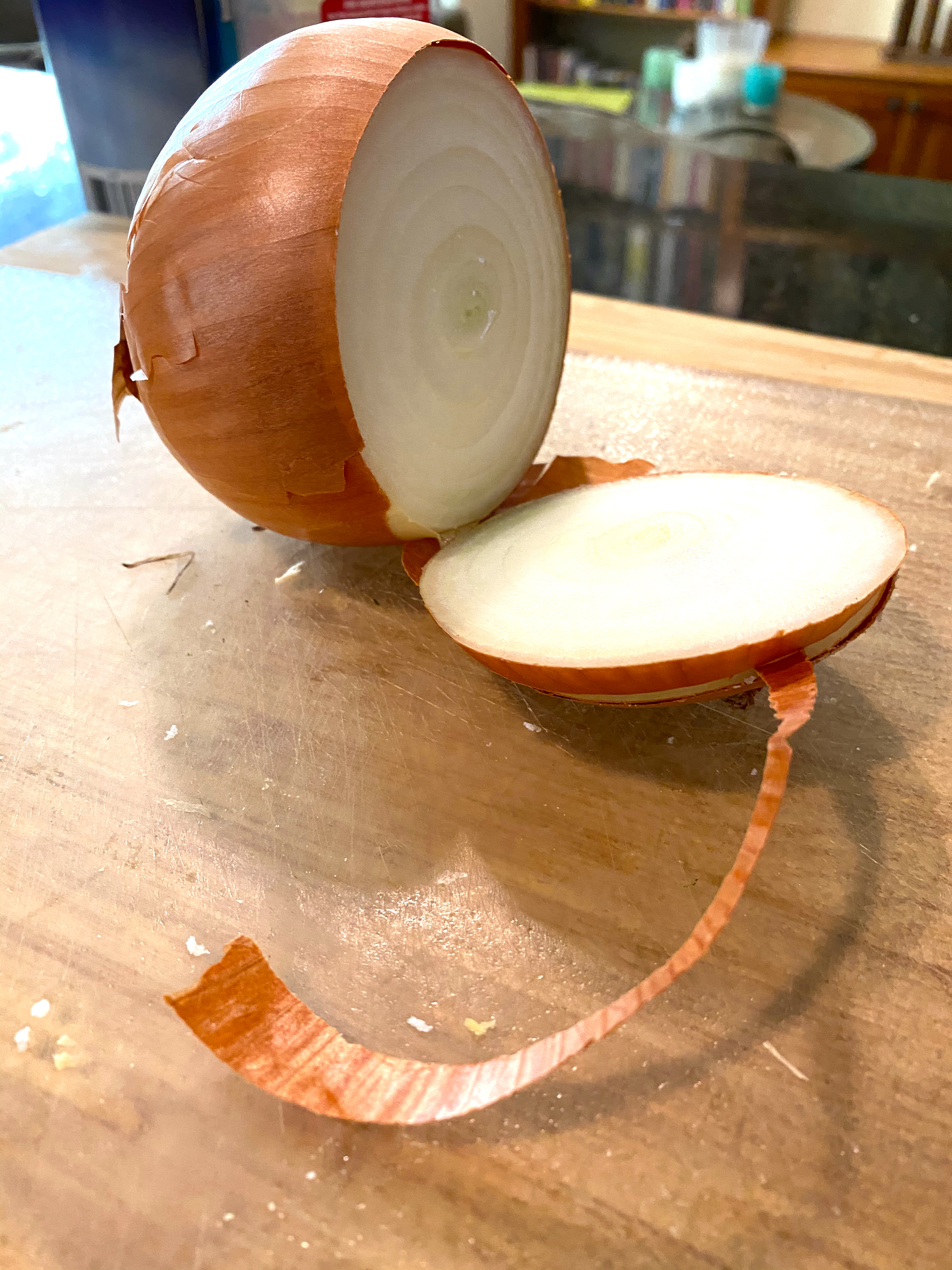 As you can see, I got a creamy, slickly thickened consistency because I added more cheese back and continued to stir over low heat…and of course I turned the burgers so they could finish cooking as well – then it was time to take a bun, put it on a plate, and add a nice thick slice of onion: