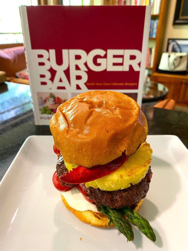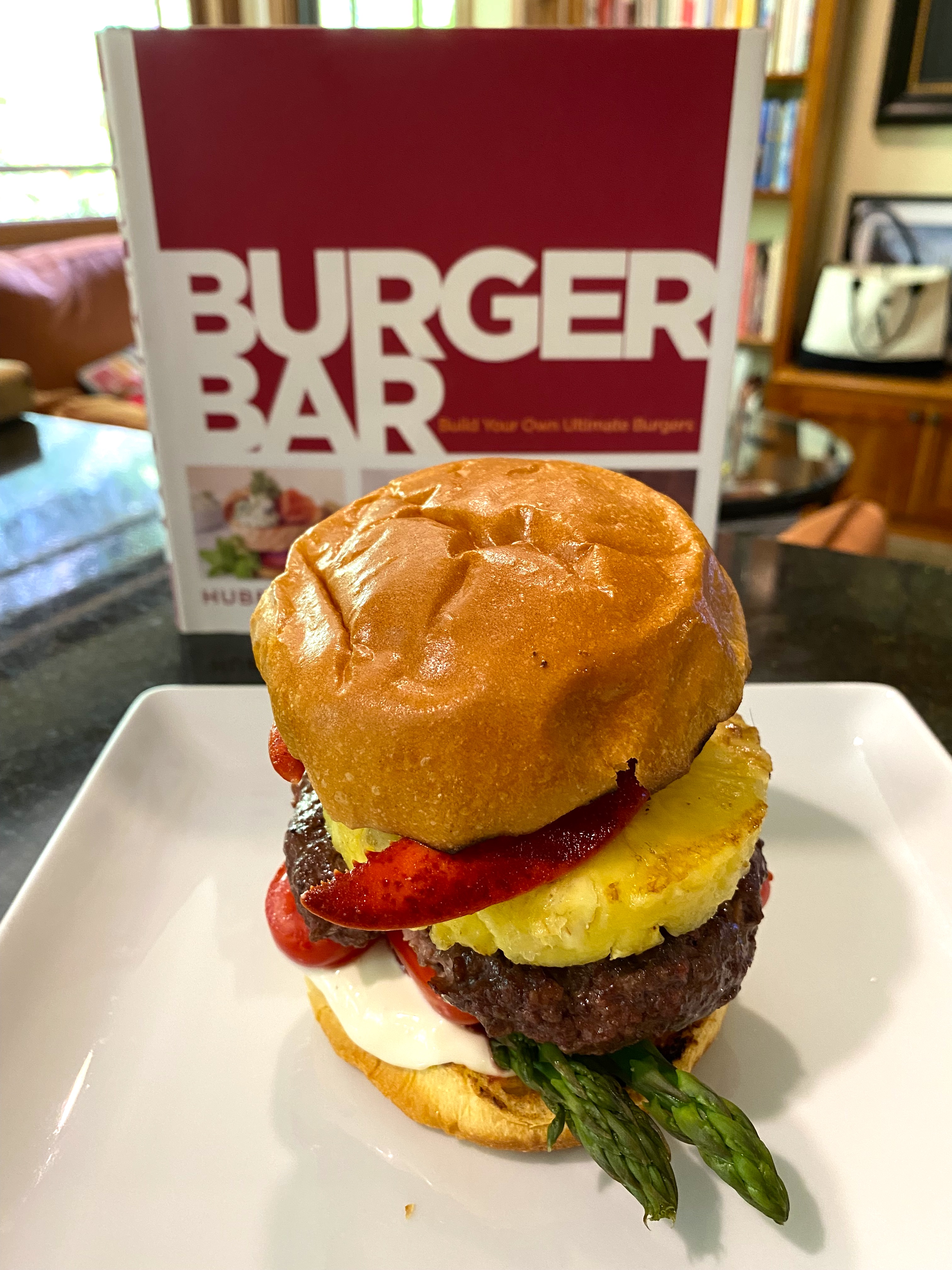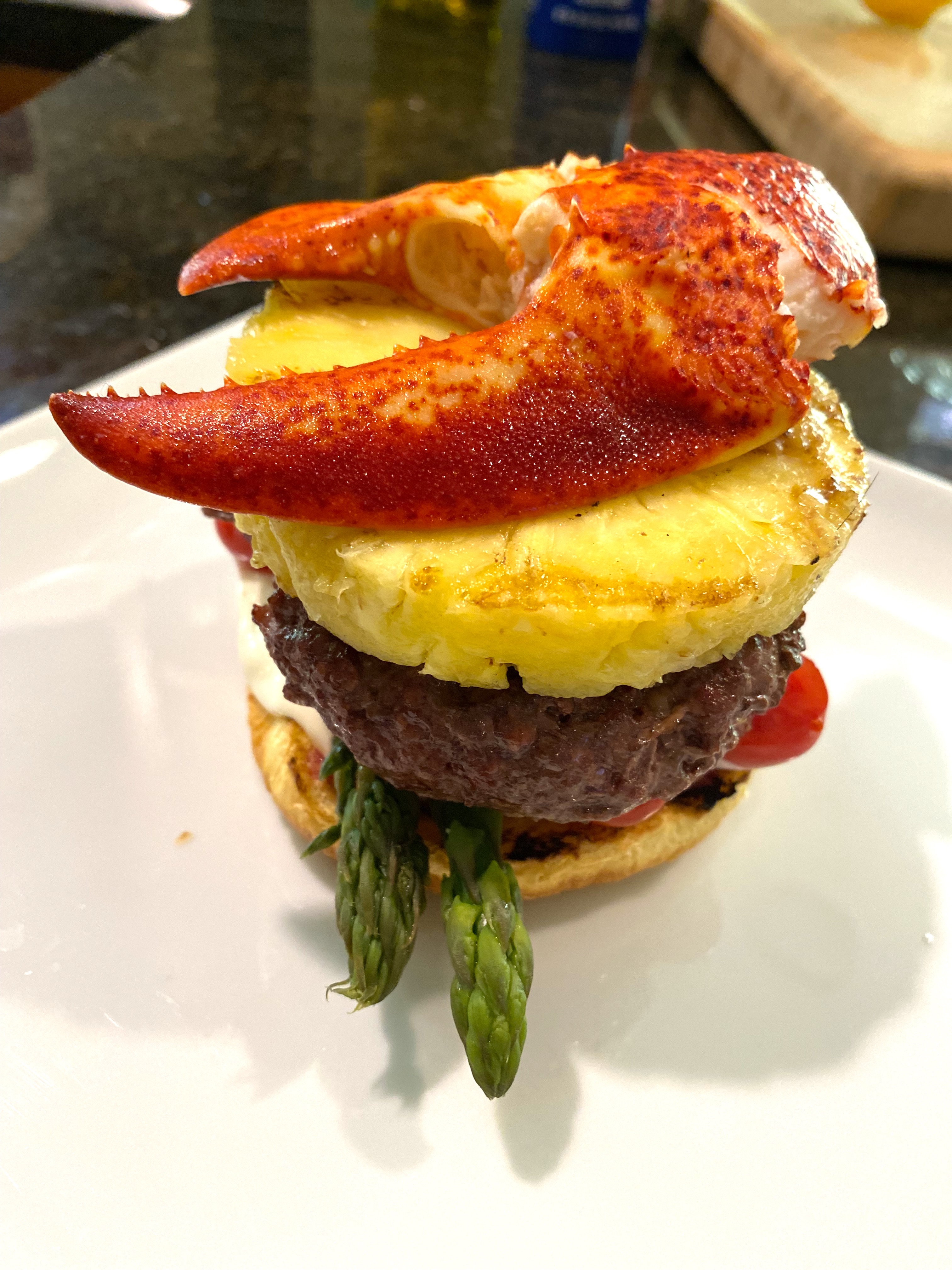 I love this burger’s look: the creamy lemon mayo and the crisp green asparagus; bright red tomato, a nice medium-rare burger patty with a hint of salt and Pepper, the yellow pineapple and the bright red lobster claw!