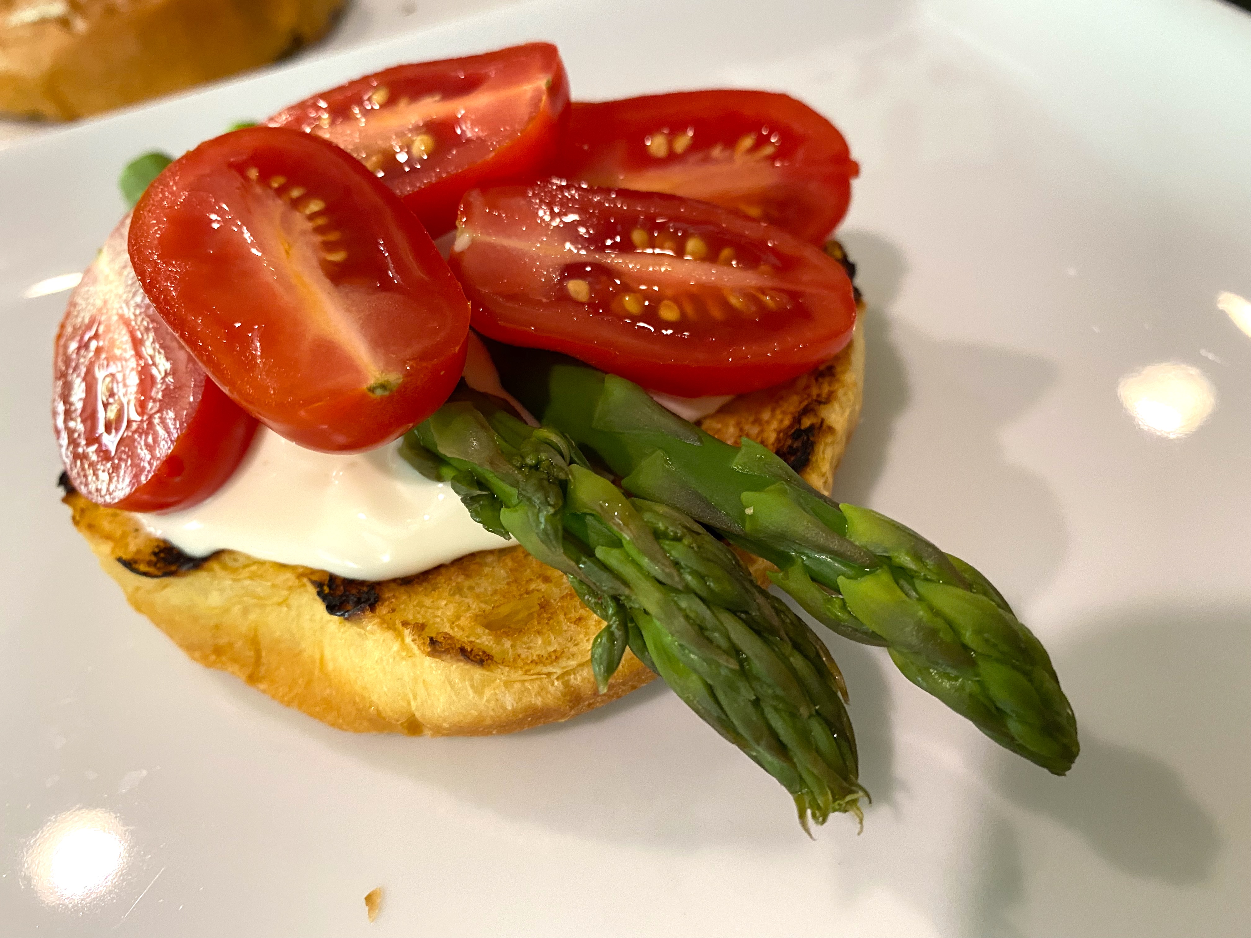 I got nice, toasty grill marks on my bottom bun, and I slathered a healthy dollop of lemon mayo on the bottom, then laid some blanched asparagus down next…