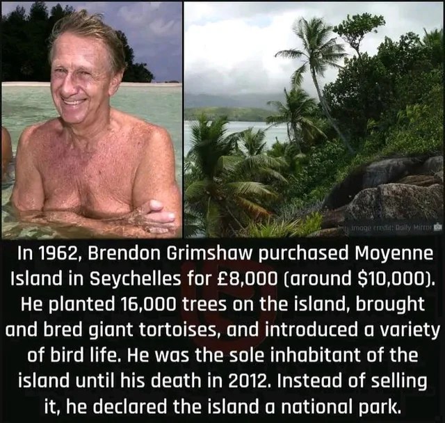 Over the course of 39 years, they planted 16,000 trees, created nearly 5 kilometers of trails, and reintroduced over 100 giant tortoises, helping to save the species from extinction. Brendon also attracted 2,000 new species of birds to the island, turning what was once a barren piece of land into a true paradise for wildlife. Today, the island is home to two-thirds of the wildlife in the Seychelles.