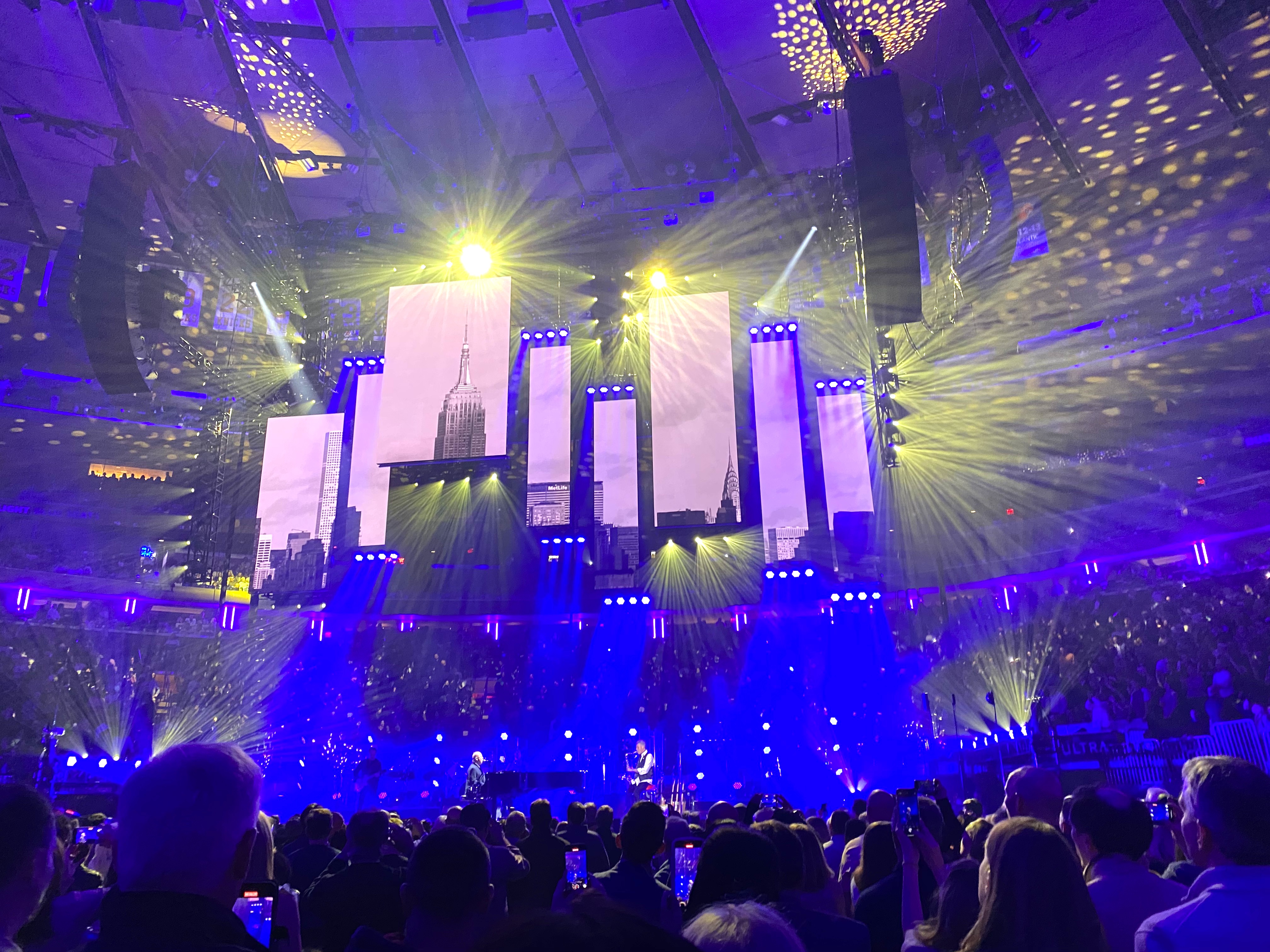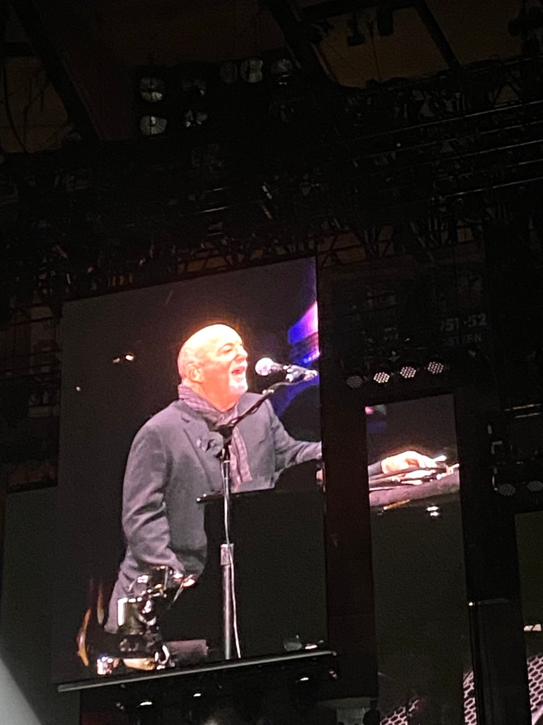 Joel took total command from the beginning, with terrific energy and voice. In this shot, the massive monitors above showcase the skyline of New York City while Joel sits at his piano – which rotated during the show so everyone in the house could see him!