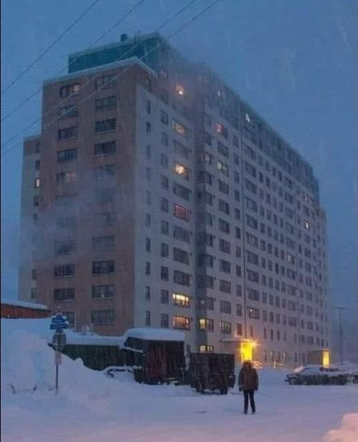 The town of Whittier, Alaska, is known for having nearly the entire population living in a single apartment building.The building is called Begich Towers, a 14-story apartment complex that houses about 90% of the town’s residents (total: 272). This has earned Whittier the nickname of a “town under one roof”.The building, originally constructed as an army barracks, now serves as a cozy condominium featuring a post office, general store, police station, laundromat, health clinic, mayor’s office, and a heated indoor pool.Whittier, Alaska is accessible only by air or through a single-lane tunnel that stretches over two miles through neighboring Maynard Mountain. The town’s weather conditions can be harsh during winter, making the Begich Towers a convenient and practical living solution for the residents.In addition to the Begich Towers, there is a second condo building in the town where the remaining residents live. The town’s school and gym are located in a separate structure but are connected to the Begich Towers by a tunnel, allowing for easy access during the winter months.” Credit: Jessica Garza