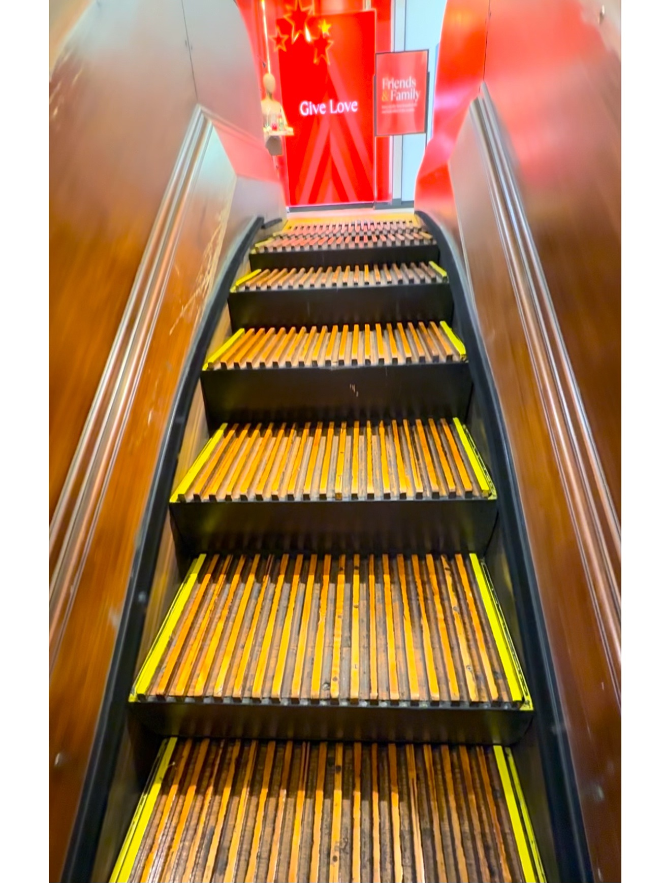 These escalators run all the way to the top of the building: wooden railing, wooden siding and yes even wooden steps! Here’s a look: