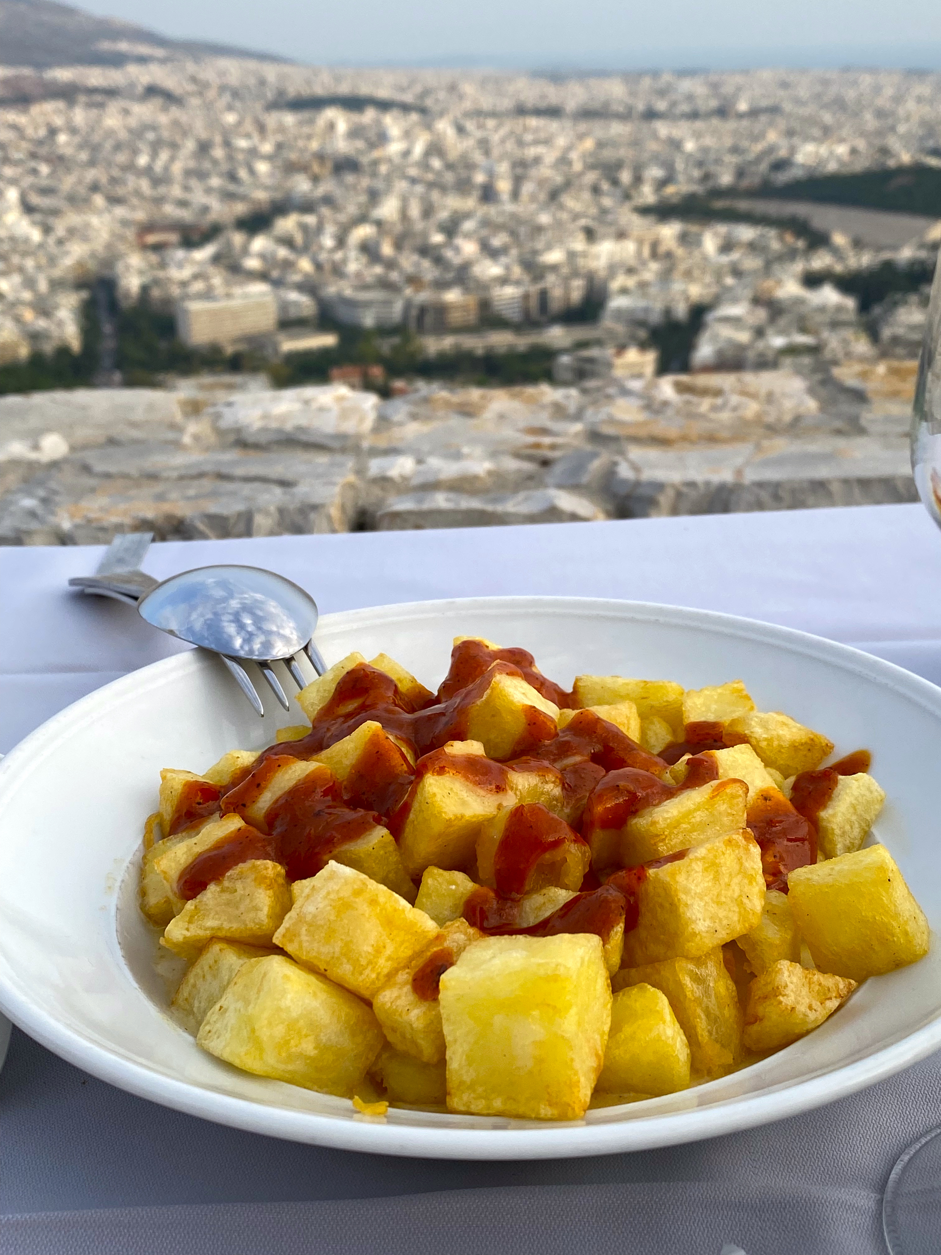 Yes, that is all of Athens stretched out before us – and a terrific dish of potatoes bravas! See our “food with a view” up close here: