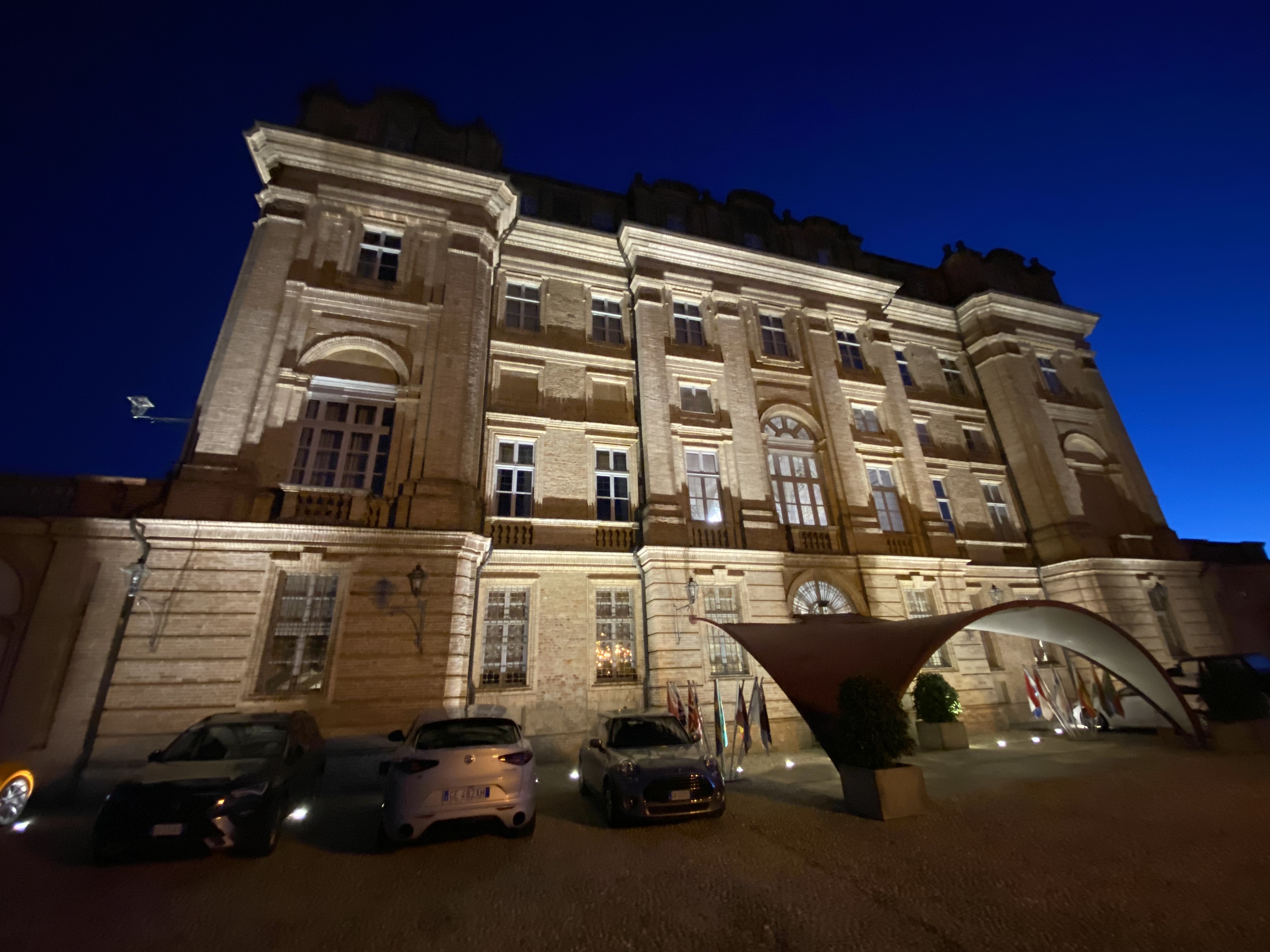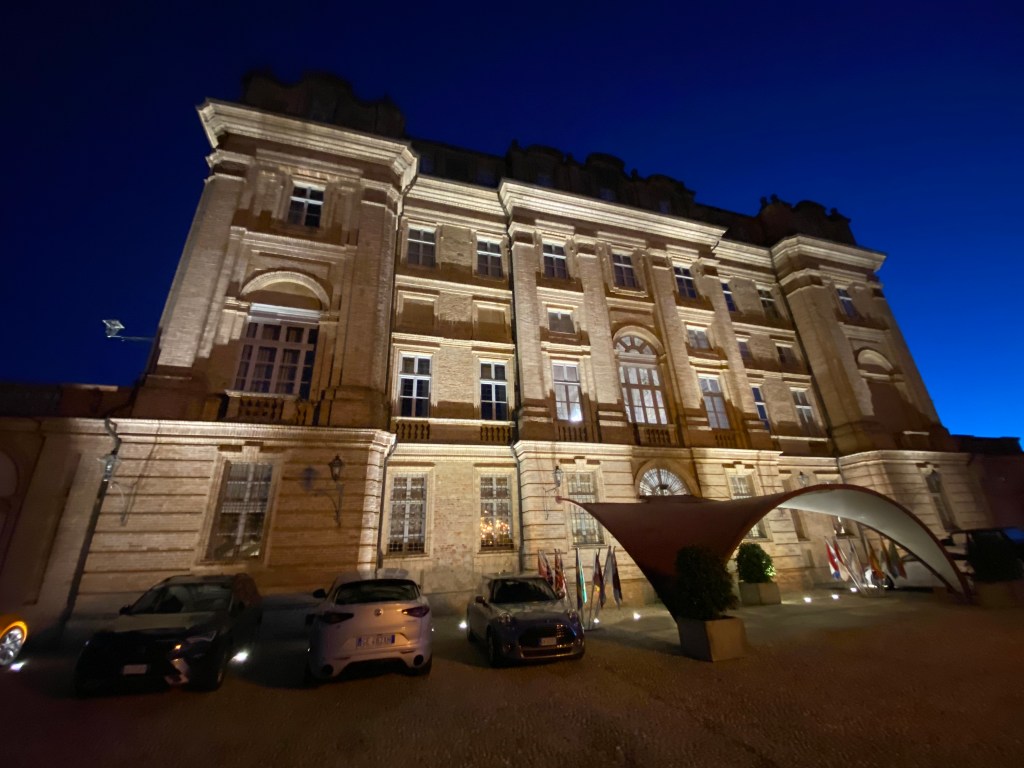 We had a short one night stay. It was 315 miles from Cortona to Guarene Italy, and this break in driving ended this way – with a gorgeous nighttime shot of the valley from the hotel: