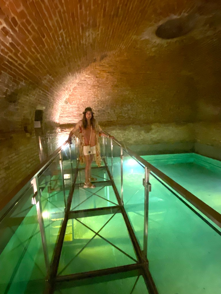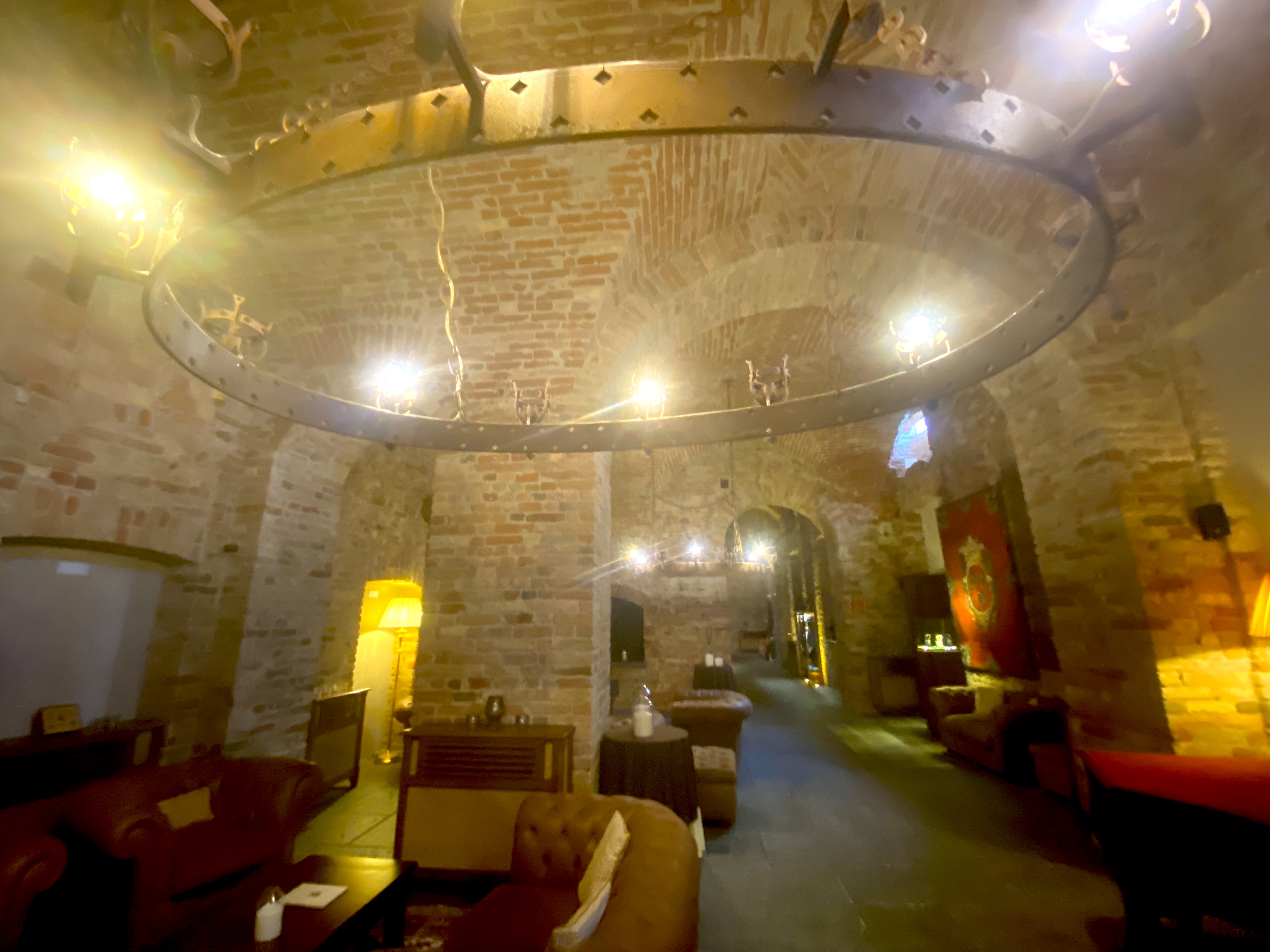 This long brick vaulted hallway runs underneath the hotel, and looks even cooler when you film your wife walking down it like this: