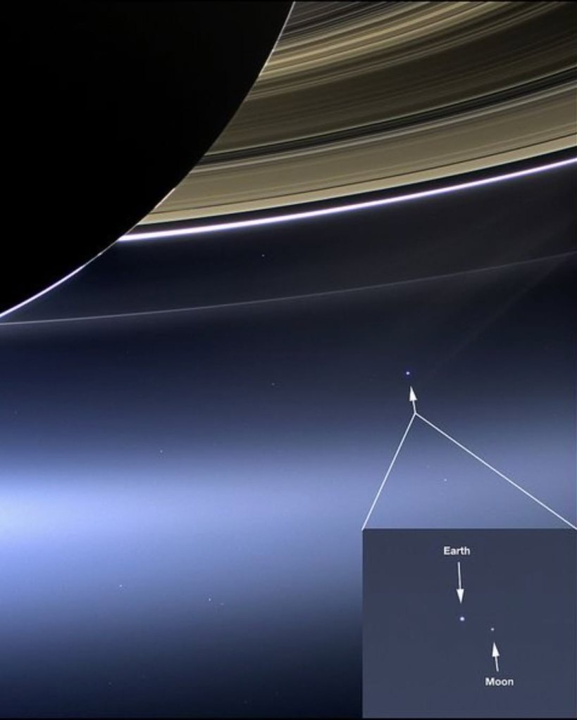 That’s Saturn at the upper left of the photo, with its massive rings…and that tiny speck is the earth!