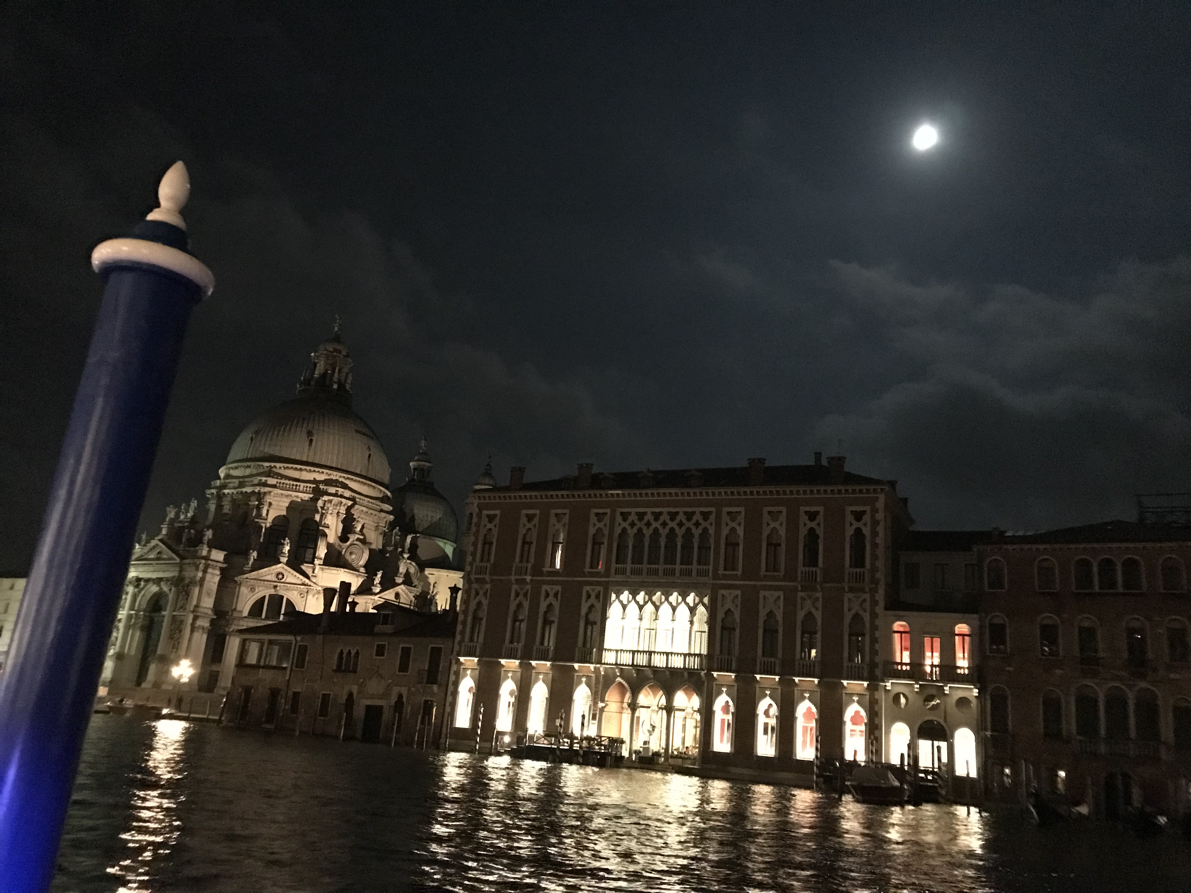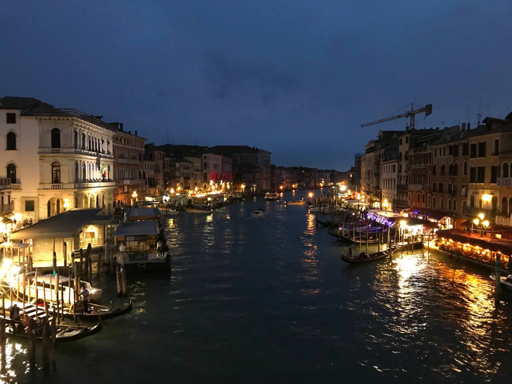 By the time we got back to our hotel, the city has begun to slow down, so we sat at our bar and had one last drink, with this view of the Grand Canal…