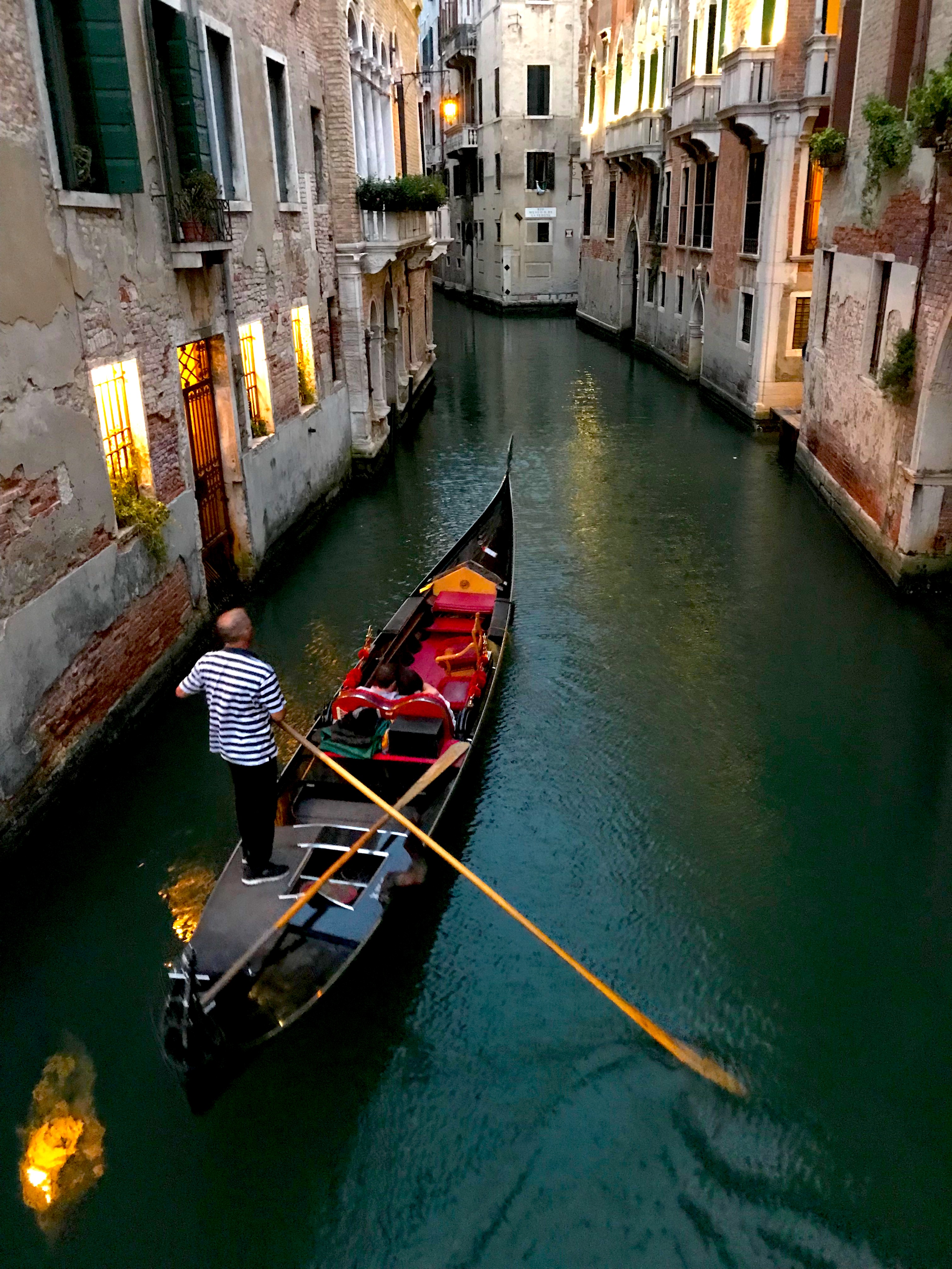 As lights are turned on, the last Gondoliers take people into the canals for a different perspective on the classic buildings around them: