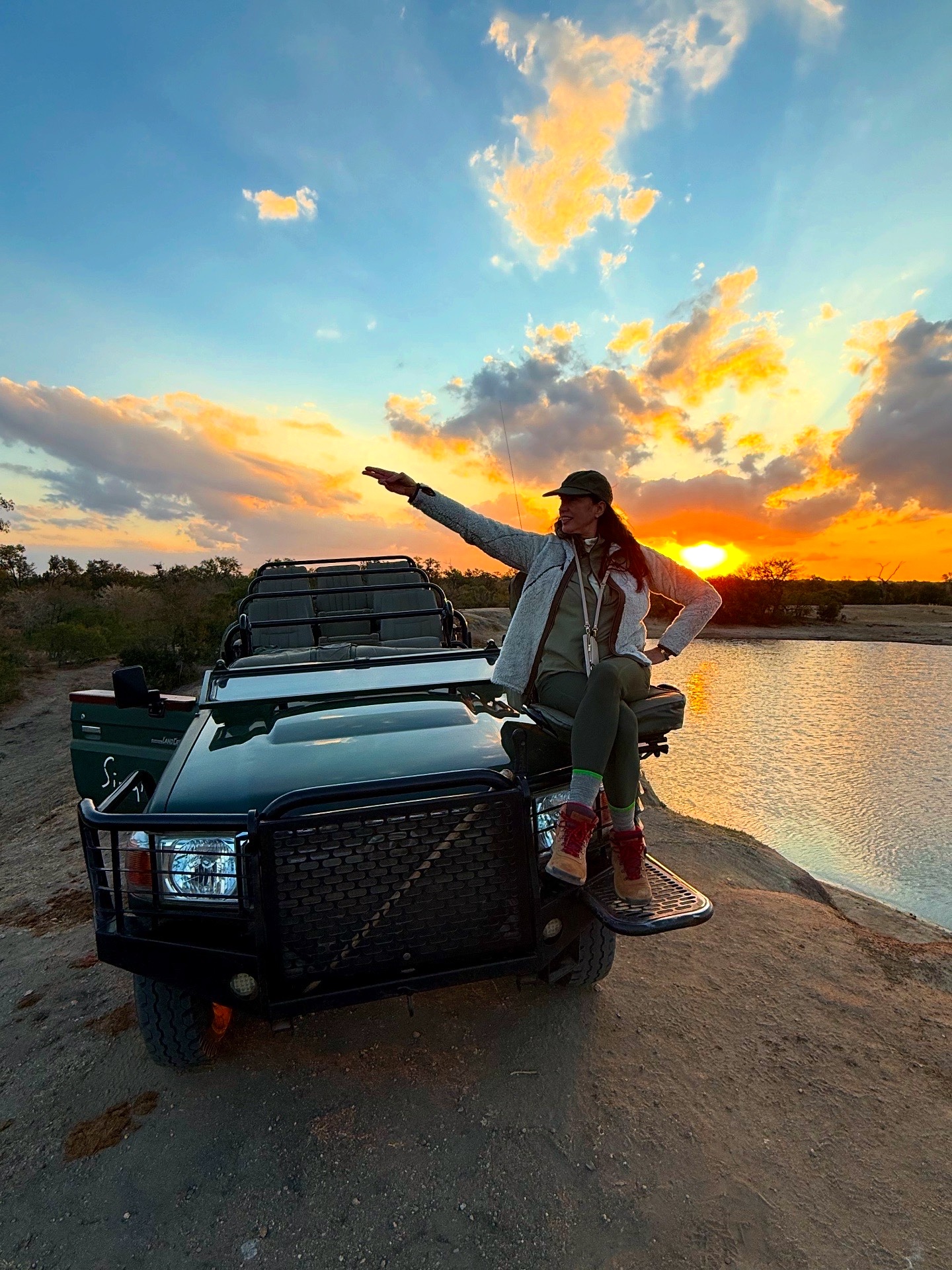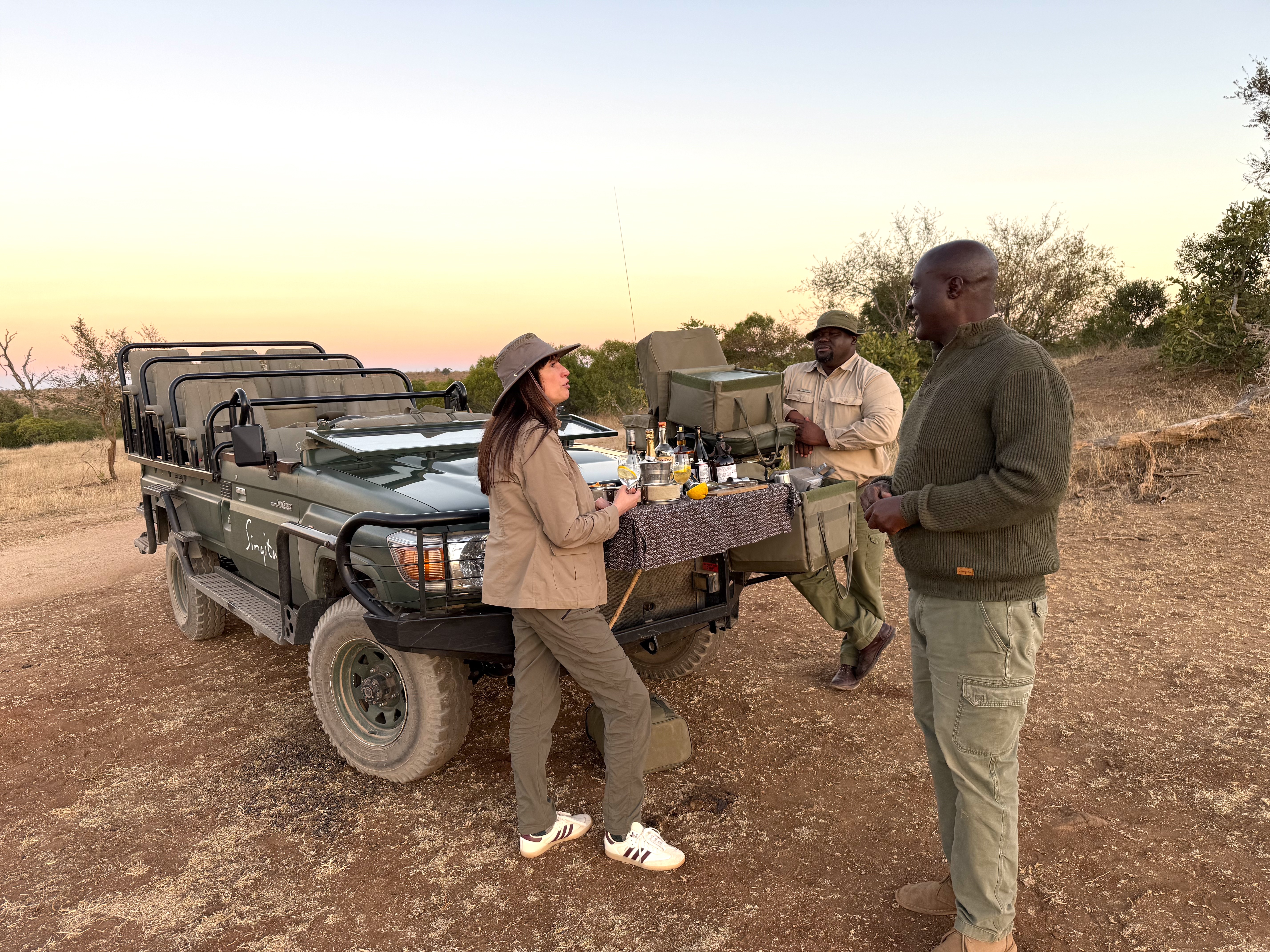 Here’s how a safari works: every single morning we did a 6a safari that lasted for 4+ hours, then we had a few hours off for lunch and relaxation before heading back out for our afternoon safari at 4p…our days always ended with a “safari sundowner”, where our Guide George and Tracker Louis stopped at a gorgeous viewing location and put out snacks and drinks for us to enjoy!