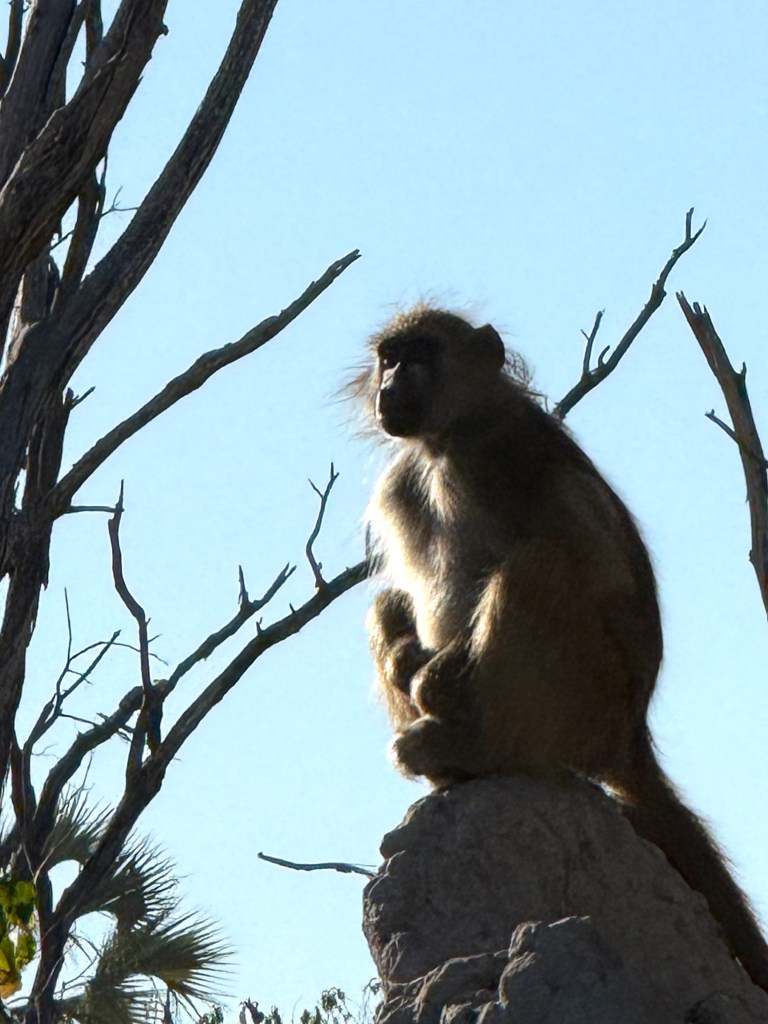 This Baboon yelled at us on our safari for daring to sit out on our terrace…but this was just the beginning of our Baboon interaction.