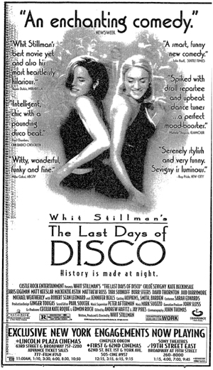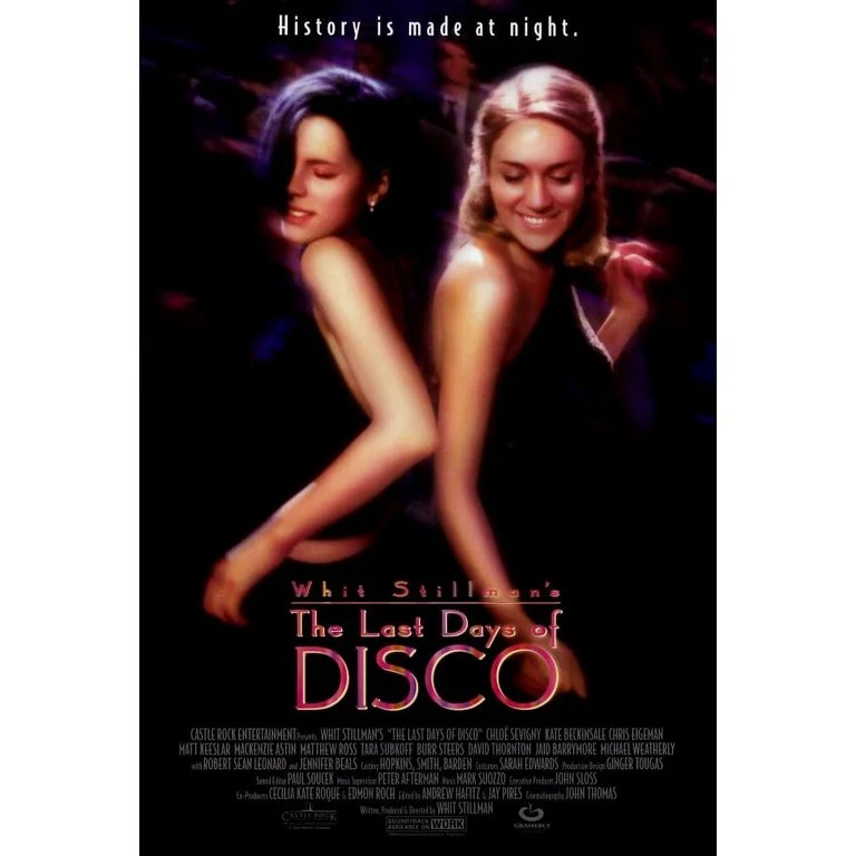 Chloë Sevigny and Kate Beckinsale play roommates with opposite personalities who frequent disco clubs together. The Last Days of Disco concludes a trilogy loosely based on Stillman’s life and contains many references to the previous two films: a character considers a move to Spain to work for American ad agencies there after meeting with the Barcelona character of Ted Boynton, and Metropolitan’s heroine Audrey Rouget reappears briefly as a successful publisher, as do a few other characters from that film, as club goers.