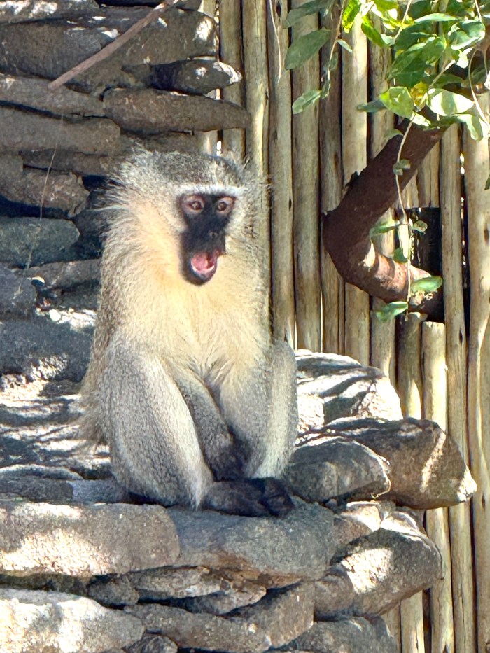 I did some research and discovered that Monkeys are everywhere here! Vervet monkey troops are commonly found moving around the lodges in South Africa…they aren’t dangerous, just pesky – watch closely as one Monkey flings himself into a tree while members of his family gather: