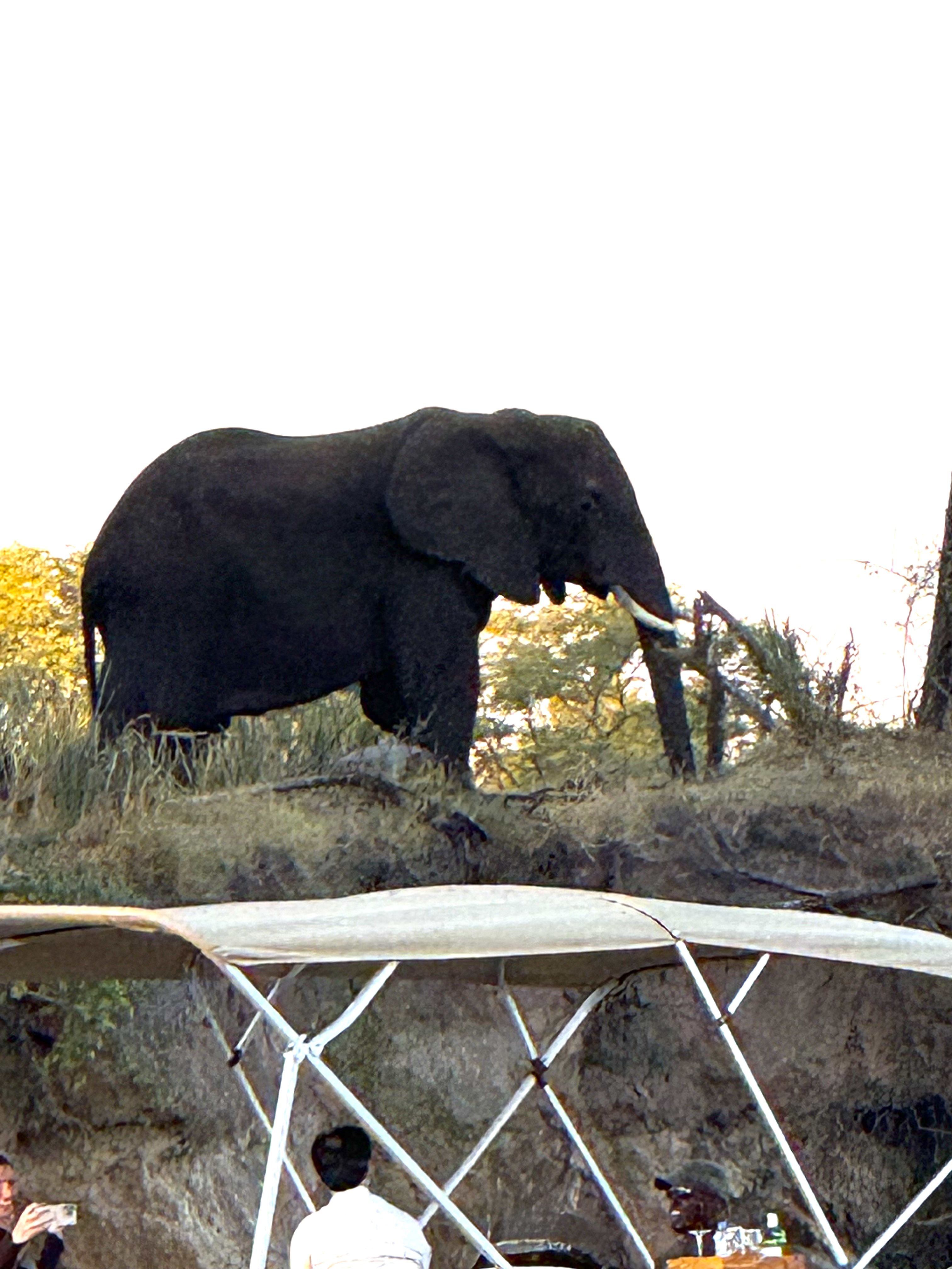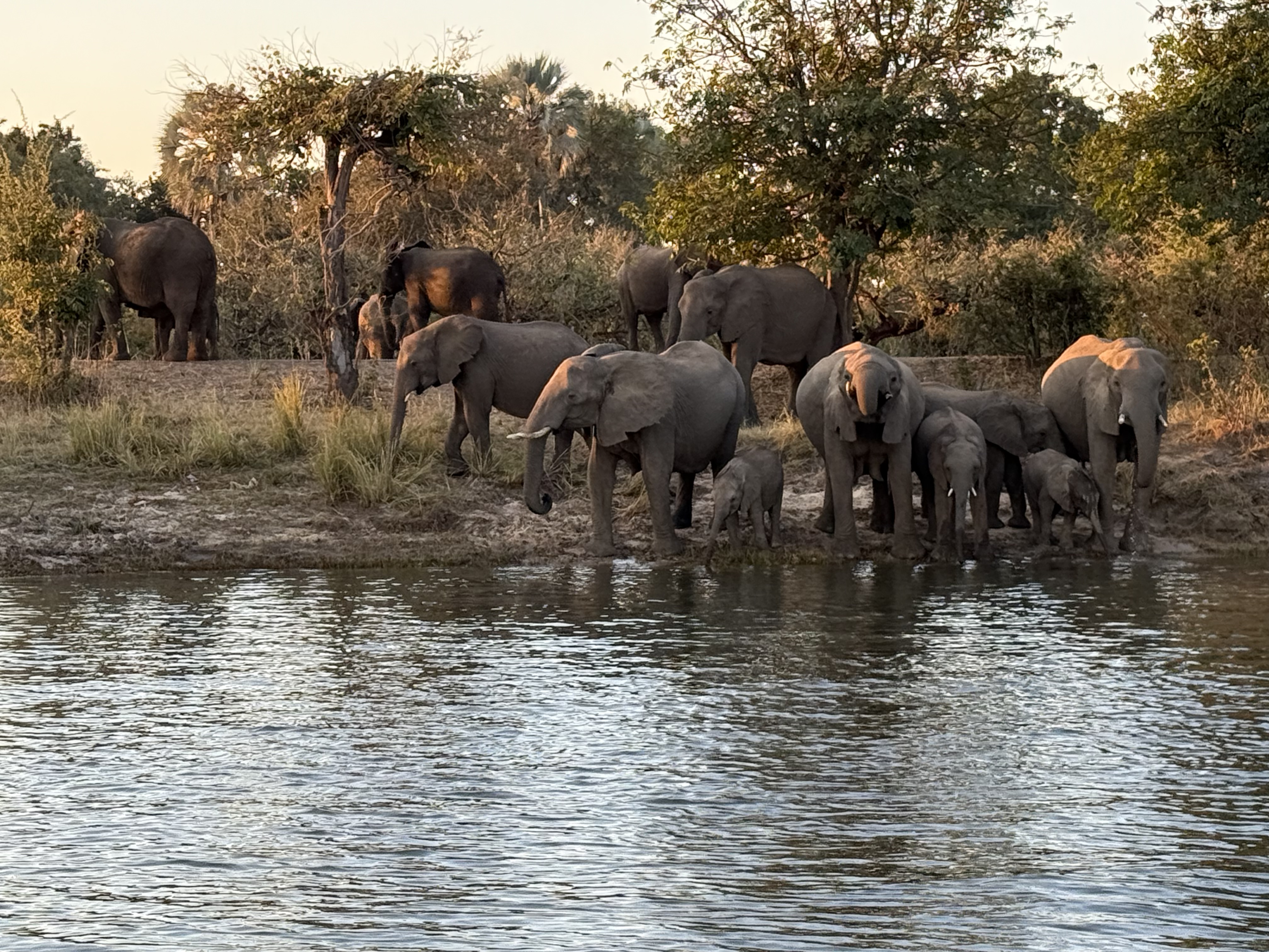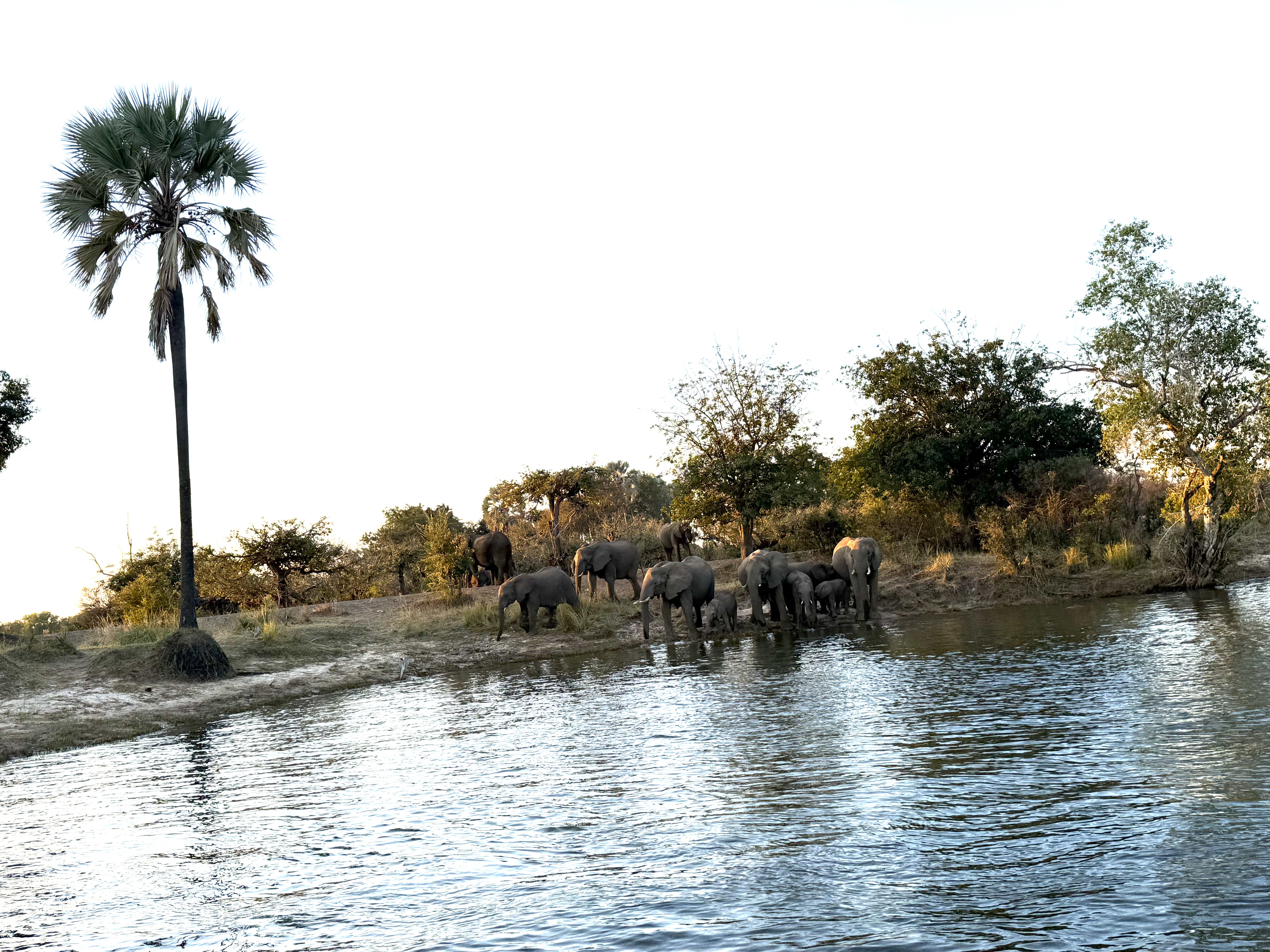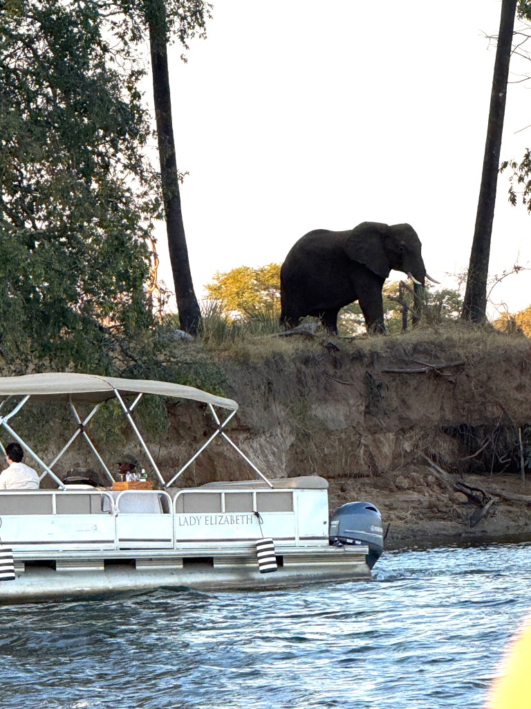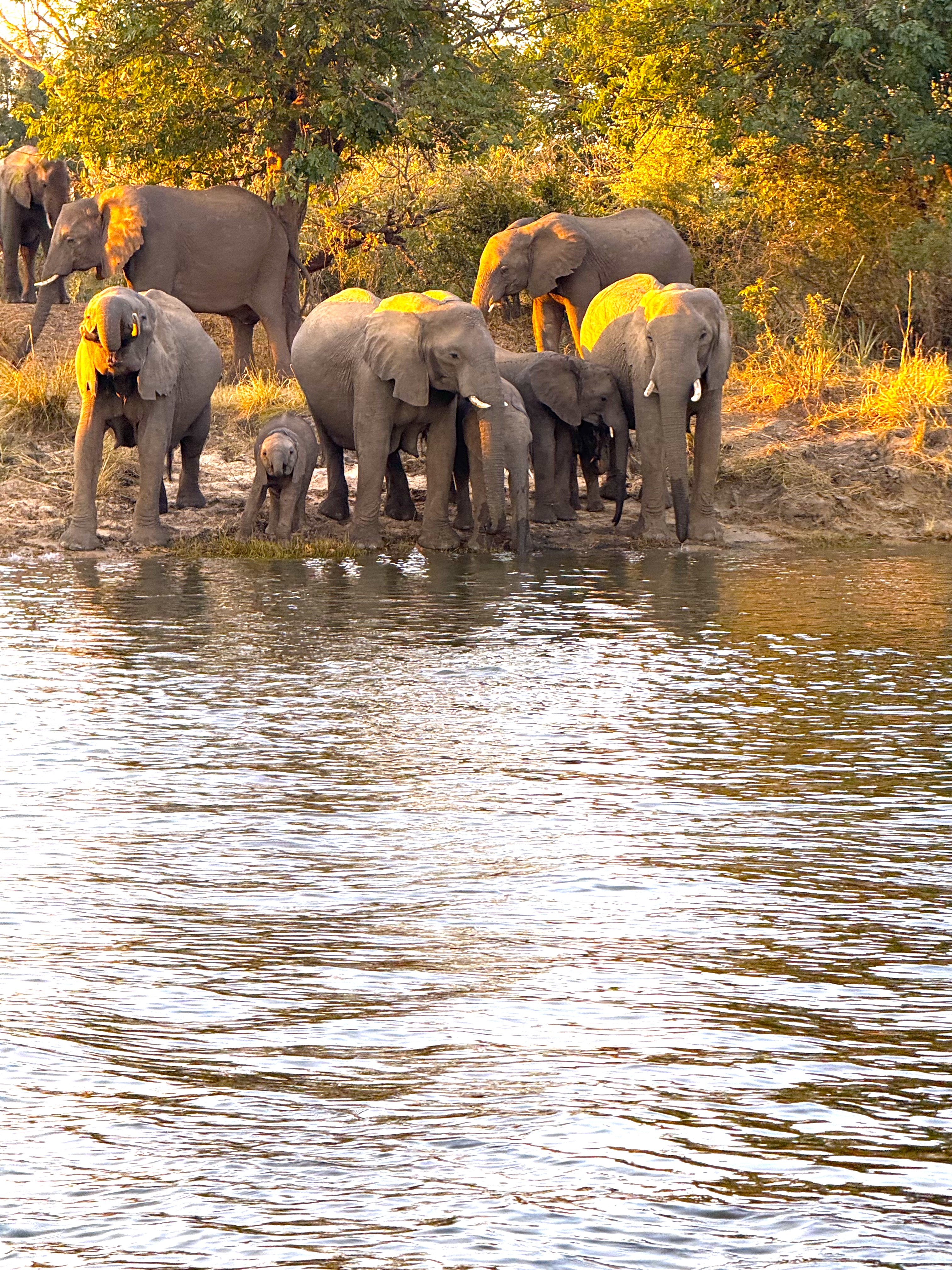 As for that private suite on the river, you can only get to the suite by boat – and our boat was crossing the Zambezi river toward Zambia’s shoreline, where a massive herd of Elephants were having a drink!