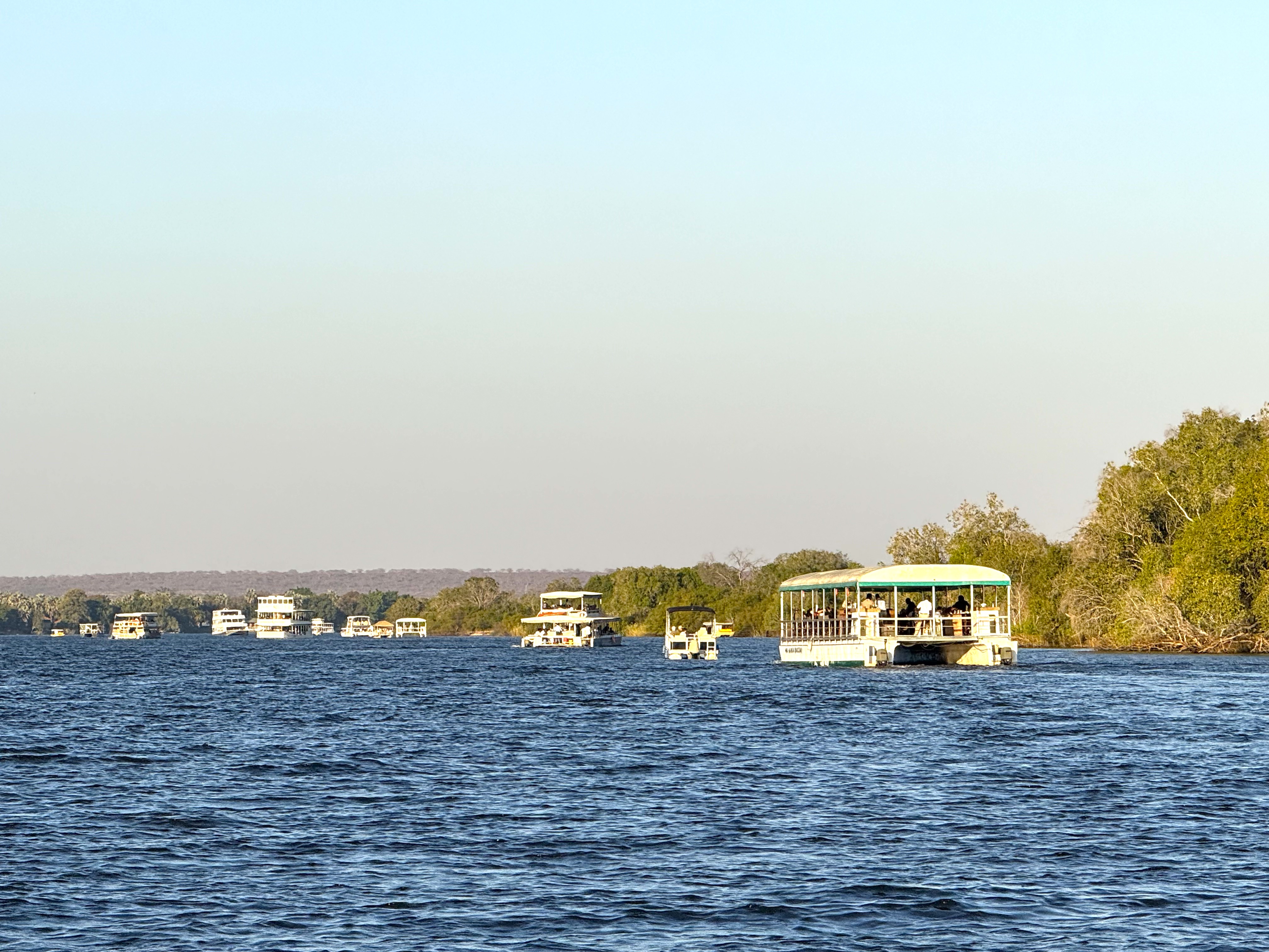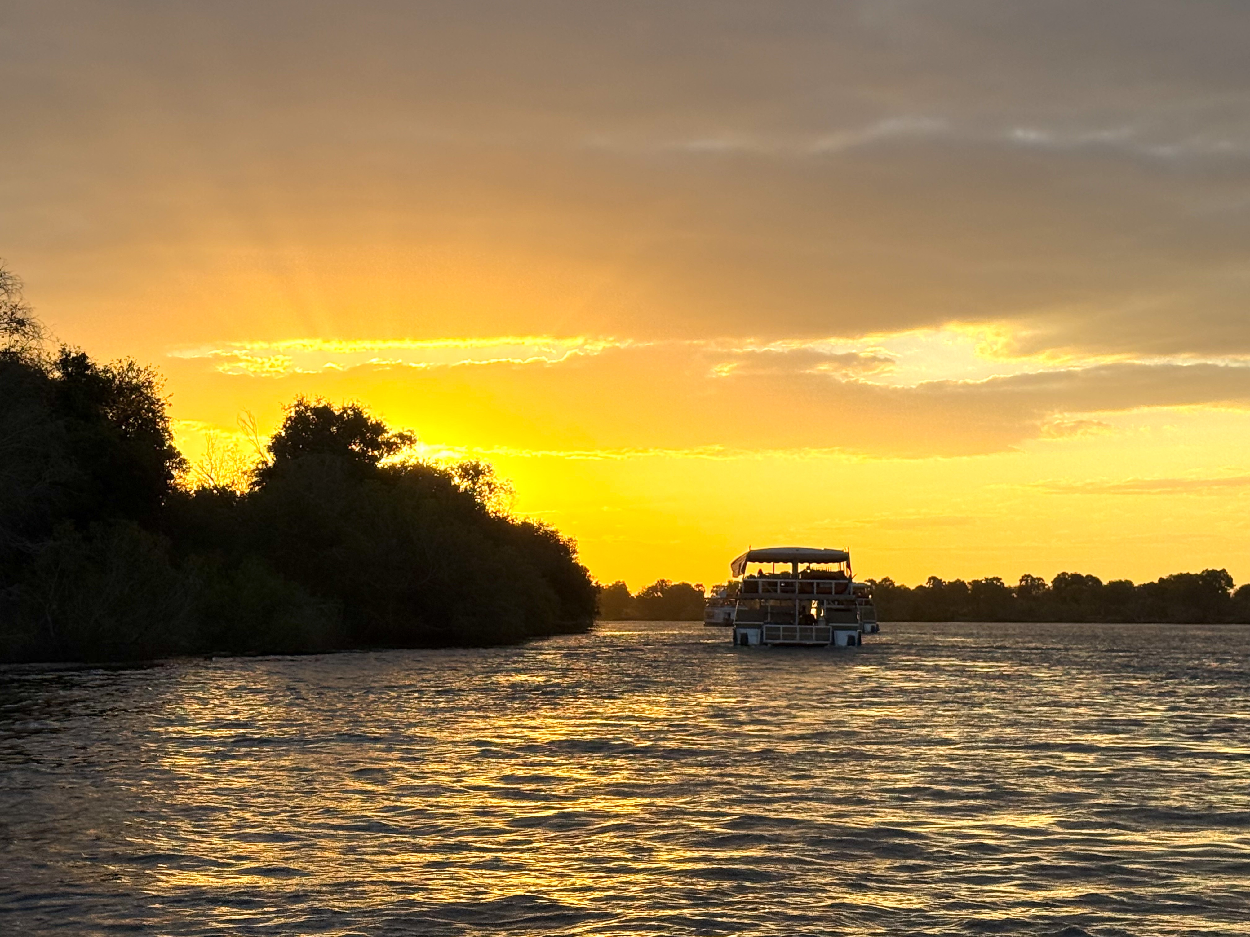 Once in place, we toasted and watched the sun set on the Zambezi river between Zimbabwe and Zambia: