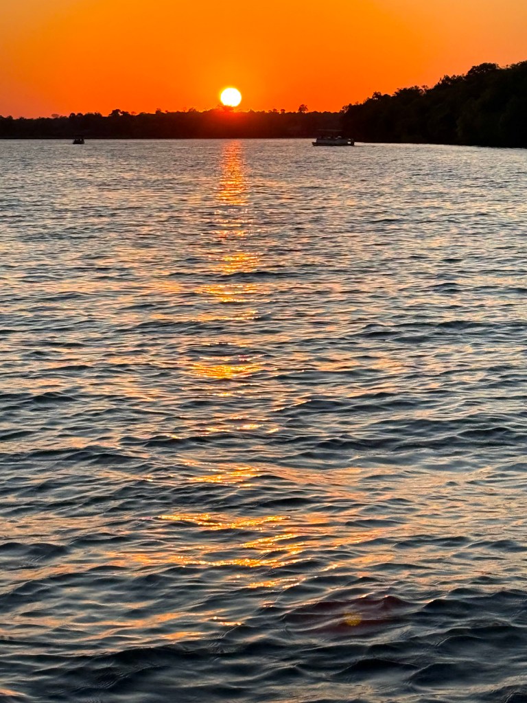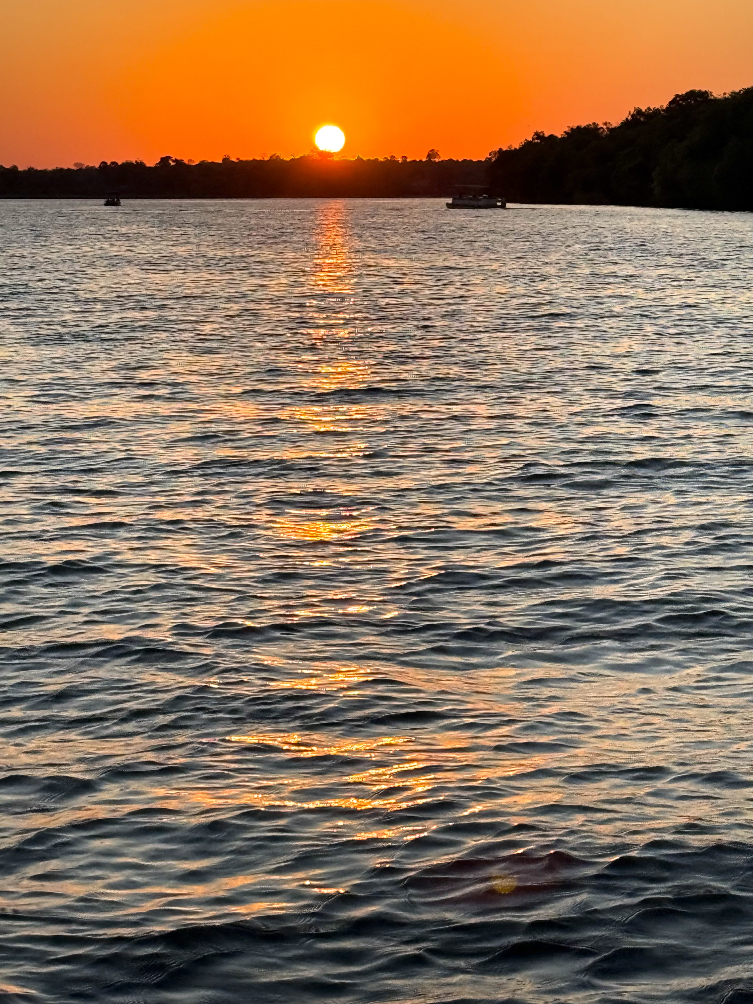 I am sharing a truly spectacular night scene from Africa! You are on the massive Zambezi River, which forms a watery boundary between Zimbabwe and Zambia!