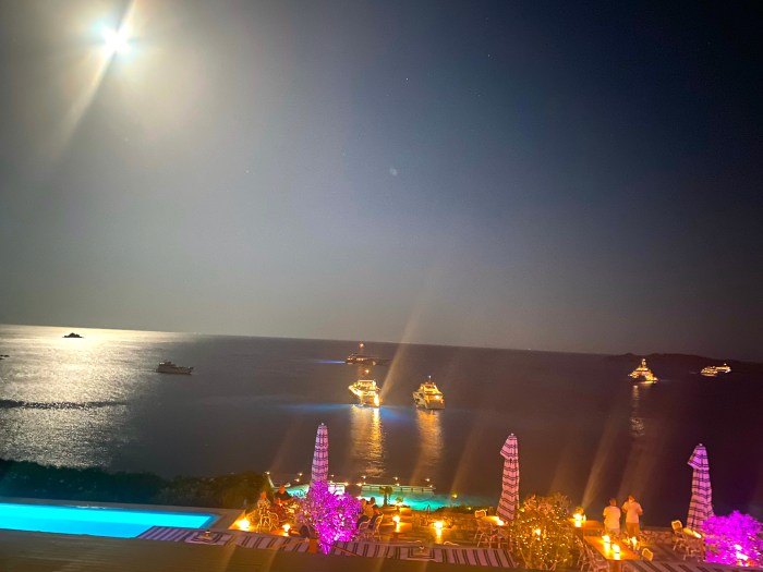 While in Mykonos, we stayed at the incredible Santa Marina Resort…with this incredible view at night, and where every day we saw a very unique surfing technique!