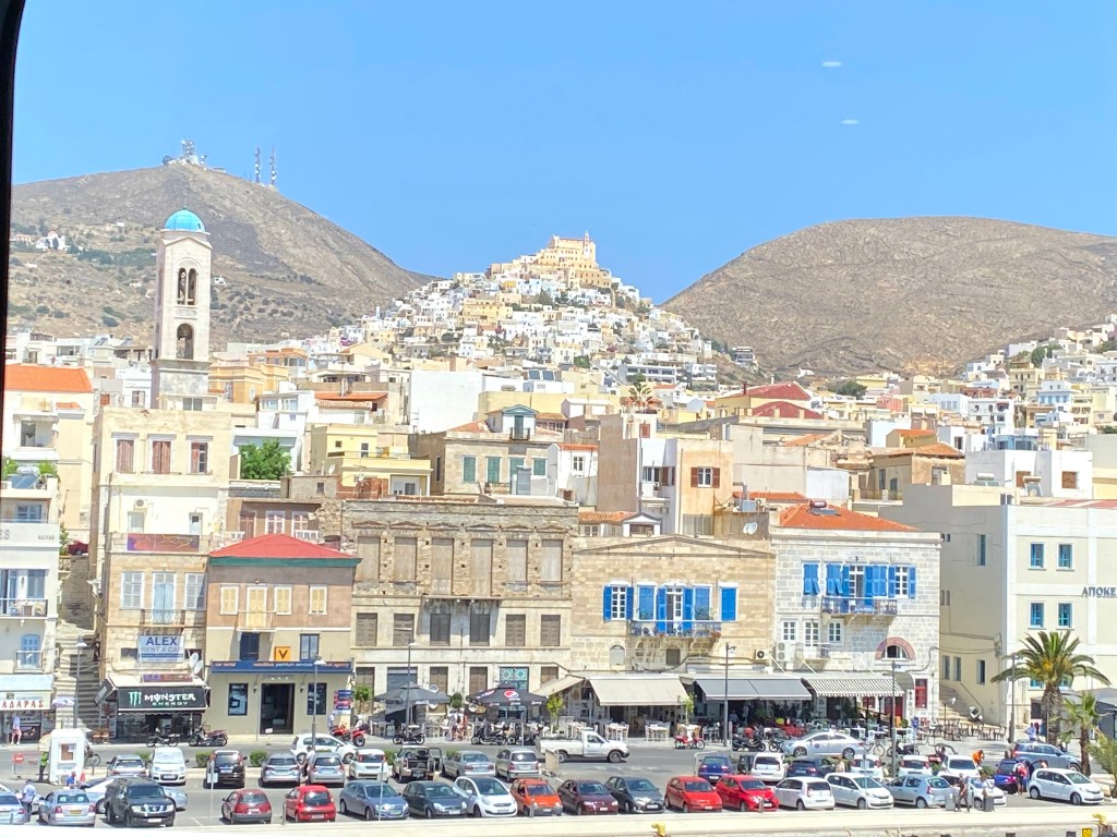 It’s a visually stunning way to travel in Greece – take a ferry from one island to the other! And of course, your reward when landing is lots of chances to have “food with a view!”